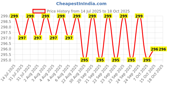 The current price is ₹296, which is ₹1 (0.3%) higher than the best price of ₹295 last seen on 30 Aug 2025. Over the 96 day price history period, prices have ranged from ₹295 to ₹299, with an average of ₹297. The pricing has been quite stable with low volatility, with prices remaining relatively stable overall. In terms of recent activity, there have been 0 price changes this week, 8 this month, and 18 over the past year. If you need this product now, it's a reasonable time to buy as prices are stable, but you might want to monitor for potential better deals.