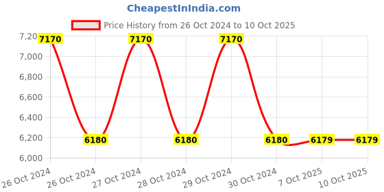 Great news for shoppers! The current price of ₹6,179 is at its best ever level. Over the 349 day price history period, prices have ranged from ₹6,179 to ₹7,170, with an average of ₹6,551. The pricing shows moderate volatility, and the overall trend is favorable for consumers as prices are getting cheaper. In terms of recent activity, there have been 0 price changes this week, 0 this month, and 6 over the past year. If you need this product now, it's a reasonable time to buy as prices are stable, but you might want to monitor for potential better deals.