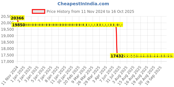 The current price is ₹17,434, which is ₹2 (0.0%) higher than the best price of ₹17,432 last seen on 15 Jul 2025. Over the 338 day price history period, prices have ranged from ₹17,432 to ₹20,366, with an average of ₹19,042. The pricing shows moderate volatility, and the overall trend is favorable for consumers as prices are getting cheaper. In terms of recent activity, there have been 0 price changes this week, 7 this month, and 108 over the past year. If you need this product now, it's a reasonable time to buy as prices are stable, but you might want to monitor for potential better deals.