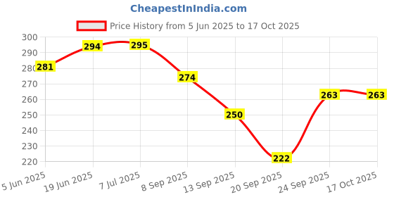 The current price is ₹263, which is ₹41 (18.5%) higher than the best price of ₹222 last seen on 20 Sep 2025. Over the 133 day price history period, prices have ranged from ₹222 to ₹295, with an average of ₹268. The pricing shows moderate volatility, and the overall trend is favorable for consumers as prices are getting cheaper. In terms of recent activity, there have been 0 price changes this week, 1 this month, and 6 over the past year. If you need this product now, it's a reasonable time to buy as prices are stable, but you might want to monitor for potential better deals.
