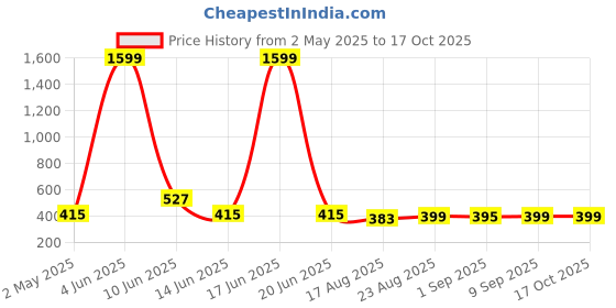 The current price is ₹399, which is ₹16 (4.2%) higher than the best price of ₹383 last seen on 17 Aug 2025. Over the 167 day price history period, prices have ranged from ₹383 to ₹1,599, with an average of ₹631. The pricing shows high volatility with significant fluctuations, with prices remaining relatively stable overall. In terms of recent activity, there have been 0 price changes this week, 0 this month, and 9 over the past year. If you need this product now, it's a reasonable time to buy as prices are stable, but you might want to monitor for potential better deals.