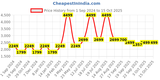 The current price is ₹2,499, which is ₹700 (38.9%) higher than the best price of ₹1,799 last seen on 19 Sep 2024. Over the 409 day price history period, prices have ranged from ₹1,799 to ₹4,499, with an average of ₹2,673. The pricing shows high volatility with significant fluctuations, but the overall trend is concerning as prices are getting more expensive. In terms of recent activity, there have been 0 price changes this week, 3 this month, and 15 over the past year. Consider waiting before making a purchase as prices are rising and better deals may be available later.