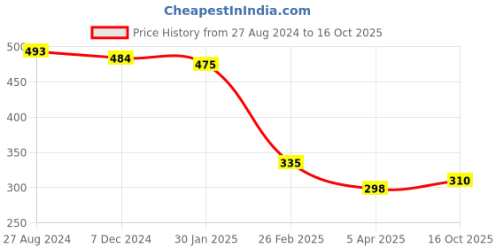 The current price is ₹310, which is ₹12 (4.0%) higher than the best price of ₹298 last seen on 5 Apr 2025. Over the 415 day price history period, prices have ranged from ₹298 to ₹493, with an average of ₹399. The pricing shows high volatility with significant fluctuations, and the overall trend is favorable for consumers as prices are getting cheaper. In terms of recent activity, there have been 0 price changes this week, 0 this month, and 4 over the past year. If you need this product now, it's a reasonable time to buy as prices are stable, but you might want to monitor for potential better deals.