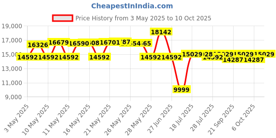 The current price is ₹15,029, which is ₹5,030 (50.3%) higher than the best price of ₹9,999 last seen on 4 Jul 2025. Over the 160 day price history period, prices have ranged from ₹9,999 to ₹18,142, with an average of ₹15,284. The pricing shows moderate volatility, with prices remaining relatively stable overall. In terms of recent activity, there have been 0 price changes this week, 3 this month, and 23 over the past year. If you need this product now, it's a reasonable time to buy as prices are stable, but you might want to monitor for potential better deals.