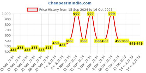 The current price is ₹449, which is ₹114 (34.0%) higher than the best price of ₹335 last seen on 15 Sep 2024. Over the 396 day price history period, prices have ranged from ₹335 to ₹999, with an average of ₹521. The pricing shows high volatility with significant fluctuations, but the overall trend is concerning as prices are getting more expensive. In terms of recent activity, there have been 0 price changes this week, 0 this month, and 9 over the past year. If you need this product now, it's a reasonable time to buy as prices are stable, but you might want to monitor for potential better deals.