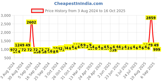 The current price is ₹999, which is ₹141 (16.4%) higher than the best price of ₹858 last seen on 14 Sep 2024. Over the 439 day price history period, prices have ranged from ₹858 to ₹2,859, with an average of ₹1,142. The pricing shows high volatility with significant fluctuations, with prices remaining relatively stable overall. In terms of recent activity, there have been 0 price changes this week, 0 this month, and 31 over the past year. The price direction is uncertain, so monitor the situation for a few more days before making a decision.