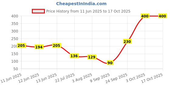The current price is ₹400, which is ₹310 (344.4%) higher than the best price of ₹90 last seen on 9 Sep 2025. Over the 127 day price history period, prices have ranged from ₹90 to ₹400, with an average of ₹221. The pricing shows high volatility with significant fluctuations, but the overall trend is concerning as prices are getting more expensive. In terms of recent activity, there have been 0 price changes this week, 1 this month, and 7 over the past year. Consider waiting before making a purchase as prices are rising and better deals may be available later.