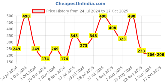 The current price is ₹206, which is ₹32 (18.4%) higher than the best price of ₹174 last seen on 29 Oct 2024. Over the 449 day price history period, prices have ranged from ₹174 to ₹498, with an average of ₹308. The pricing shows high volatility with significant fluctuations, and the overall trend is favorable for consumers as prices are getting cheaper. In terms of recent activity, there have been 0 price changes this week, 0 this month, and 11 over the past year. If you need this product now, it's a reasonable time to buy as prices are stable, but you might want to monitor for potential better deals.