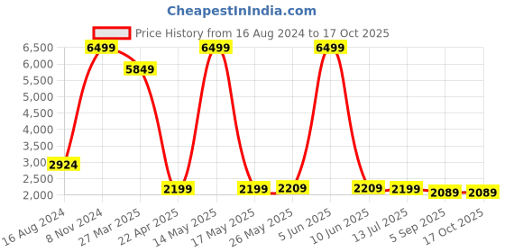 Good news! The current price of ₹2,089 is at its best ever level. Over the 426 day price history period, prices have ranged from ₹2,089 to ₹6,499, with an average of ₹3,622. The pricing shows high volatility with significant fluctuations, and the overall trend is favorable for consumers as prices are getting cheaper. In terms of recent activity, there have been 0 price changes this week, 0 this month, and 9 over the past year. This is an excellent time to make a purchase as prices are trending downward and conditions appear favorable.