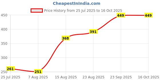 The current price is ₹449, which is ₹198 (78.9%) higher than the best price of ₹251 last seen on 7 Aug 2025. Over the 83 day price history period, prices have ranged from ₹251 to ₹449, with an average of ₹362. The pricing shows high volatility with significant fluctuations, but the overall trend is concerning as prices are getting more expensive. In terms of recent activity, there have been 0 price changes this week, 0 this month, and 4 over the past year. If you need this product now, it's a reasonable time to buy as prices are stable, but you might want to monitor for potential better deals.