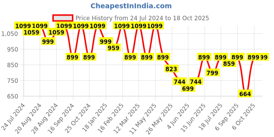 The current price is ₹899, which is ₹235 (35.4%) higher than the best price of ₹664 last seen on 23 Sep 2025. Over the 451 day price history period, prices have ranged from ₹664 to ₹1,099, with an average of ₹940. The pricing shows moderate volatility, and the overall trend is favorable for consumers as prices are getting cheaper. In terms of recent activity, there have been 0 price changes this week, 1 this month, and 20 over the past year. The price direction is uncertain, so monitor the situation for a few more days before making a decision.