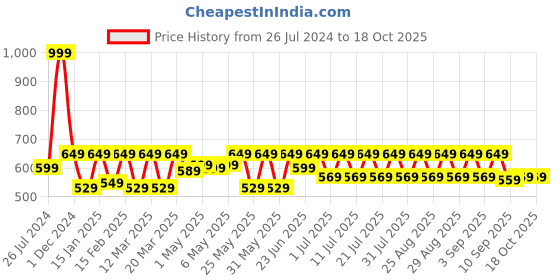 The current price is ₹569, which is ₹40 (7.6%) higher than the best price of ₹529 last seen on 1 Jan 2025. Over the 449 day price history period, prices have ranged from ₹529 to ₹999, with an average of ₹612. The pricing shows moderate volatility, and the overall trend is favorable for consumers as prices are getting cheaper. In terms of recent activity, there have been 0 price changes this week, 0 this month, and 36 over the past year. If you need this product now, it's a reasonable time to buy as prices are stable, but you might want to monitor for potential better deals.