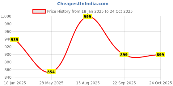 The current price is ₹899, which is ₹45 (5.3%) higher than the best price of ₹854 last seen on 23 May 2025. Over the 279 day price history period, prices have ranged from ₹854 to ₹999, with an average of ₹918. The pricing shows moderate volatility, with prices remaining relatively stable overall. In terms of recent activity, there have been 0 price changes this week, 0 this month, and 3 over the past year. If you need this product now, it's a reasonable time to buy as prices are stable, but you might want to monitor for potential better deals.