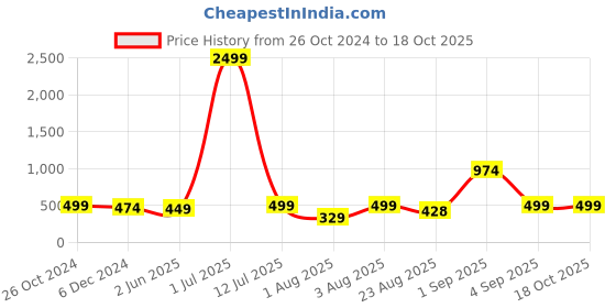 The current price is ₹499, which is ₹170 (51.7%) higher than the best price of ₹329 last seen on 1 Aug 2025. Over the 357 day price history period, prices have ranged from ₹329 to ₹2,499, with an average of ₹695. The pricing shows high volatility with significant fluctuations, with prices remaining relatively stable overall. In terms of recent activity, there have been 0 price changes this week, 0 this month, and 9 over the past year. The price direction is uncertain, so monitor the situation for a few more days before making a decision.