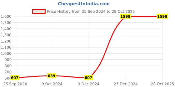 The current price is ₹1,599, which is ₹992 (163.4%) higher than the best price of ₹607 last seen on 25 Sep 2024. Over the 397 day price history period, prices have ranged from ₹607 to ₹1,599, with an average of ₹1,010. The pricing shows high volatility with significant fluctuations, but the overall trend is concerning as prices are getting more expensive. In terms of recent activity, there have been 0 price changes this week, 0 this month, and 1 over the past year. Consider waiting before making a purchase as prices are rising and better deals may be available later.