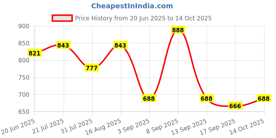 The current price is ₹688, which is ₹22 (3.3%) higher than the best price of ₹666 last seen on 17 Sep 2025. Over the 116 day price history period, prices have ranged from ₹666 to ₹888, with an average of ₹767. The pricing shows moderate volatility, and the overall trend is favorable for consumers as prices are getting cheaper. In terms of recent activity, there have been 0 price changes this week, 1 this month, and 8 over the past year. If you need this product now, it's a reasonable time to buy as prices are stable, but you might want to monitor for potential better deals.