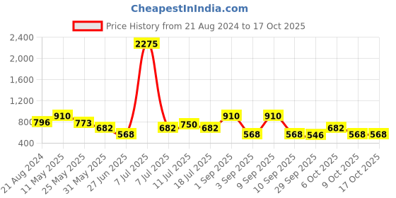 The current price is ₹568, which is ₹22 (4.0%) higher than the best price of ₹546 last seen on 29 Sep 2025. Over the 421 day price history period, prices have ranged from ₹546 to ₹2,275, with an average of ₹790. The pricing shows high volatility with significant fluctuations, and the overall trend is favorable for consumers as prices are getting cheaper. In terms of recent activity, there have been 0 price changes this week, 2 this month, and 14 over the past year. This is an excellent time to make a purchase as prices are trending downward and conditions appear favorable.