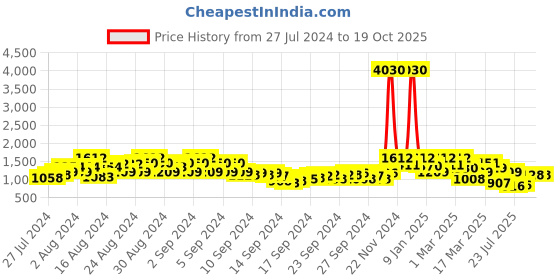 The current price is ₹1,128, which is ₹312 (38.2%) higher than the best price of ₹816 last seen on 23 Jul 2025. Over the 448 day price history period, prices have ranged from ₹816 to ₹4,030, with an average of ₹1,322. The pricing shows high volatility with significant fluctuations, but the overall trend is concerning as prices are getting more expensive. In terms of recent activity, there have been 0 price changes this week, 0 this month, and 19 over the past year. Consider waiting before making a purchase as prices are rising and better deals may be available later.