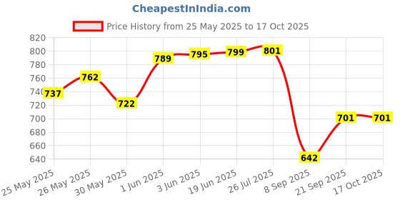 The current price is ₹701, which is ₹59 (9.2%) higher than the best price of ₹642 last seen on 8 Sep 2025. Over the 144 day price history period, prices have ranged from ₹642 to ₹801, with an average of ₹745. The pricing shows moderate volatility, with prices remaining relatively stable overall. In terms of recent activity, there have been 0 price changes this week, 0 this month, and 8 over the past year. If you need this product now, it's a reasonable time to buy as prices are stable, but you might want to monitor for potential better deals.