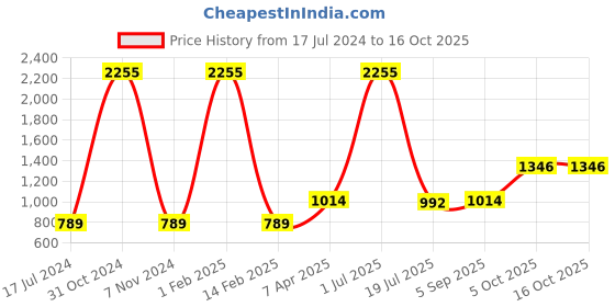 The current price is ₹1,346, which is ₹557 (70.6%) higher than the best price of ₹789 last seen on 17 Jul 2024. Over the 456 day price history period, prices have ranged from ₹789 to ₹2,255, with an average of ₹1,349. The pricing shows high volatility with significant fluctuations, but the overall trend is concerning as prices are getting more expensive. In terms of recent activity, there have been 0 price changes this week, 0 this month, and 8 over the past year. Consider waiting before making a purchase as prices are rising and better deals may be available later.