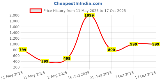 The current price is ₹999, which is ₹600 (150.4%) higher than the best price of ₹399 last seen on 31 May 2025. Over the 158 day price history period, prices have ranged from ₹399 to ₹1,999, with an average of ₹928. The pricing shows high volatility with significant fluctuations, but the overall trend is concerning as prices are getting more expensive. In terms of recent activity, there have been 0 price changes this week, 0 this month, and 5 over the past year. Consider waiting before making a purchase as prices are rising and better deals may be available later.