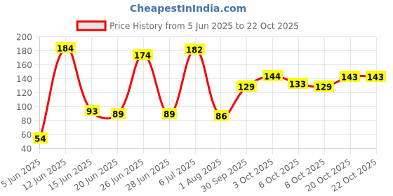 The current price is ₹143, which is ₹89 (164.8%) higher than the best price of ₹54 last seen on 5 Jun 2025. Over the 138 day price history period, prices have ranged from ₹54 to ₹184, with an average of ₹127. The pricing shows high volatility with significant fluctuations, but the overall trend is concerning as prices are getting more expensive. In terms of recent activity, there have been 0 price changes this week, 4 this month, and 12 over the past year. If you need this product now, it's a reasonable time to buy as prices are stable, but you might want to monitor for potential better deals.