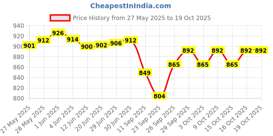 The current price is ₹892, which is ₹88 (10.9%) higher than the best price of ₹804 last seen on 23 Sep 2025. Over the 144 day price history period, prices have ranged from ₹804 to ₹926, with an average of ₹888. The pricing has been quite stable with low volatility, with prices remaining relatively stable overall. In terms of recent activity, there has been 1 price change this week, 6 this month, and 15 over the past year. If you need this product now, it's a reasonable time to buy as prices are stable, but you might want to monitor for potential better deals.
