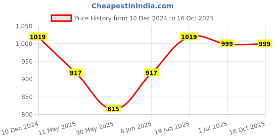 The current price is ₹999, which is ₹184 (22.6%) higher than the best price of ₹815 last seen on 30 May 2025. Over the 310 day price history period, prices have ranged from ₹815 to ₹1,019, with an average of ₹955. The pricing shows moderate volatility, with prices remaining relatively stable overall. In terms of recent activity, there have been 0 price changes this week, 0 this month, and 5 over the past year. If you need this product now, it's a reasonable time to buy as prices are stable, but you might want to monitor for potential better deals.