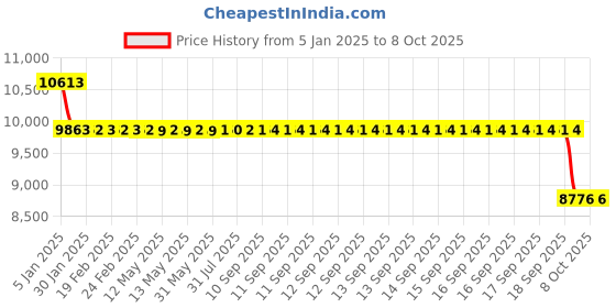 Great news for shoppers! The current price of ₹8,776 is at its best ever level. Over the 275 day price history period, prices have ranged from ₹8,776 to ₹10,613, with an average of ₹9,829. The pricing has been quite stable with low volatility, and the overall trend is favorable for consumers as prices are getting cheaper. In terms of recent activity, there have been 0 price changes this week, 25 this month, and 41 over the past year. This is an excellent time to make a purchase as prices are trending downward and conditions appear favorable.
