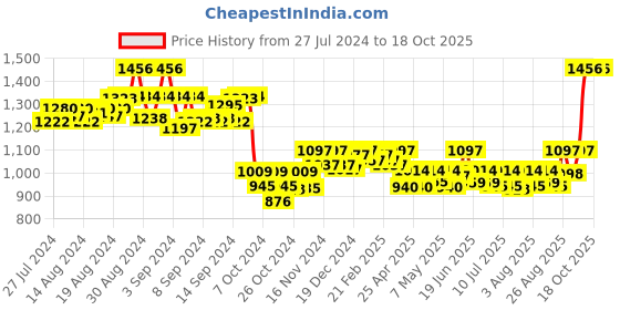 The current price is ₹1,456, which is ₹580 (66.2%) higher than the best price of ₹876 last seen on 25 Oct 2024. Over the 448 day price history period, prices have ranged from ₹876 to ₹1,456, with an average of ₹1,121. The pricing shows moderate volatility, but the overall trend is concerning as prices are getting more expensive. In terms of recent activity, there have been 0 price changes this week, 0 this month, and 41 over the past year. Consider waiting before making a purchase as prices are rising and better deals may be available later.