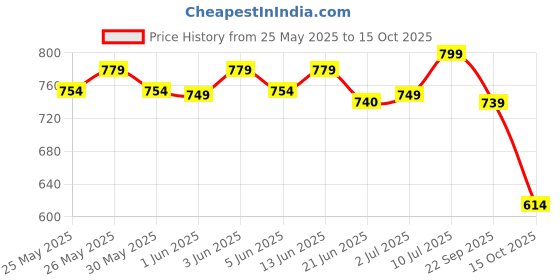 Exciting update! The current price of ₹614 is at its best ever level. Over the 143 day price history period, prices have ranged from ₹614 to ₹799, with an average of ₹749. The pricing shows moderate volatility, and the overall trend is favorable for consumers as prices are getting cheaper. In terms of recent activity, there have been 0 price changes this week, 1 this month, and 11 over the past year. This is an excellent time to make a purchase as prices are trending downward and conditions appear favorable.