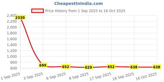 The current price is ₹638, which is ₹9 (1.4%) higher than the best price of ₹629 last seen on 8 Sep 2025. Over the 44 day price history period, prices have ranged from ₹629 to ₹2,330, with an average of ₹891. The pricing shows high volatility with significant fluctuations, and the overall trend is favorable for consumers as prices are getting cheaper. In terms of recent activity, there have been 0 price changes this week, 1 this month, and 5 over the past year. If you need this product now, it's a reasonable time to buy as prices are stable, but you might want to monitor for potential better deals.