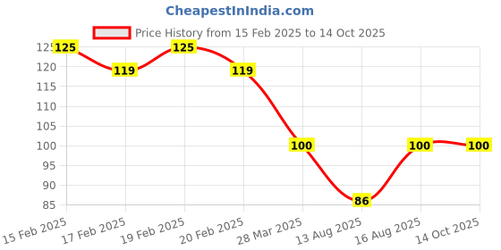 The current price is ₹100, which is ₹14 (16.3%) higher than the best price of ₹86 last seen on 13 Aug 2025. Over the 240 day price history period, prices have ranged from ₹86 to ₹125, with an average of ₹109. The pricing shows moderate volatility, and the overall trend is favorable for consumers as prices are getting cheaper. In terms of recent activity, there have been 0 price changes this week, 0 this month, and 6 over the past year. If you need this product now, it's a reasonable time to buy as prices are stable, but you might want to monitor for potential better deals.