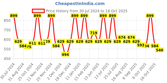 The current price is ₹584, which is ₹90 (18.2%) higher than the best price of ₹494 last seen on 6 Dec 2024. Over the 445 day price history period, prices have ranged from ₹494 to ₹899, with an average of ₹687. The pricing shows high volatility with significant fluctuations, and the overall trend is favorable for consumers as prices are getting cheaper. In terms of recent activity, there has been 1 price change this week, 3 this month, and 26 over the past year. This is an excellent time to make a purchase as prices are trending downward and conditions appear favorable.