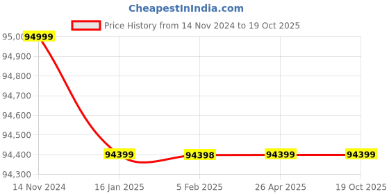 The current price is ₹94,399, which is ₹0.18 (0.0%) higher than the best price of ₹94,398.82 last seen on 5 Feb 2025. Over the 338 day price history period, prices have ranged from ₹94,398.82 to ₹94,999, with an average of ₹94,519. The pricing has been quite stable with low volatility, with prices remaining relatively stable overall. In terms of recent activity, there have been 0 price changes this week, 0 this month, and 3 over the past year. If you need this product now, it's a reasonable time to buy as prices are stable, but you might want to monitor for potential better deals.