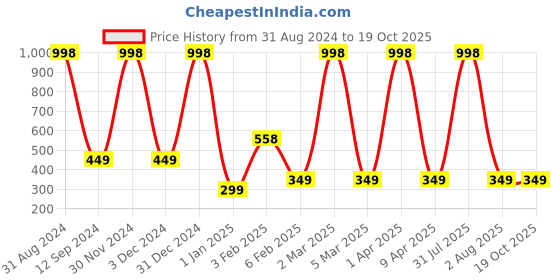 The current price is ₹349, which is ₹50 (16.7%) higher than the best price of ₹299 last seen on 1 Jan 2025. Over the 413 day price history period, prices have ranged from ₹299 to ₹998, with an average of ₹633. The pricing shows high volatility with significant fluctuations, and the overall trend is favorable for consumers as prices are getting cheaper. In terms of recent activity, there have been 0 price changes this week, 0 this month, and 11 over the past year. This is an excellent time to make a purchase as prices are trending downward and conditions appear favorable.