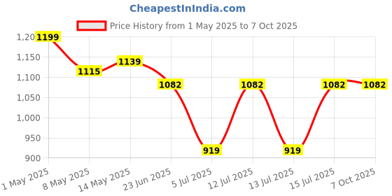 The current price is ₹1,082, which is ₹163 (17.7%) higher than the best price of ₹919 last seen on 5 Jul 2025. Over the 158 day price history period, prices have ranged from ₹919 to ₹1,199, with an average of ₹1,069. The pricing shows moderate volatility, and the overall trend is favorable for consumers as prices are getting cheaper. In terms of recent activity, there have been 0 price changes this week, 0 this month, and 7 over the past year. The price direction is uncertain, so monitor the situation for a few more days before making a decision.