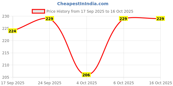 The current price is ₹229, which is ₹23 (11.2%) higher than the best price of ₹206 last seen on 4 Oct 2025. Over the 29 day price history period, prices have ranged from ₹206 to ₹229, with an average of ₹223. The pricing has been quite stable with low volatility, with prices remaining relatively stable overall. In terms of recent activity, there have been 0 price changes this week, 3 this month, and 3 over the past year. If you need this product now, it's a reasonable time to buy as prices are stable, but you might want to monitor for potential better deals.