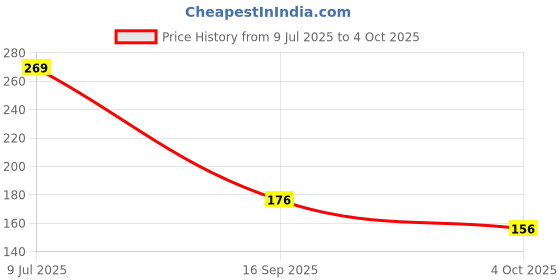 Awesome! The current price of ₹156 is at its best ever level. Over the 87 day price history period, prices have ranged from ₹156 to ₹269, with an average of ₹200. The pricing shows high volatility with significant fluctuations, and the overall trend is favorable for consumers as prices are getting cheaper. In terms of recent activity, there have been 0 price changes this week, 0 this month, and 2 over the past year. This is an excellent time to make a purchase as prices are trending downward and conditions appear favorable.