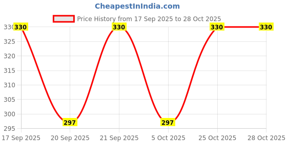 The current price is ₹330, which is ₹33 (11.1%) higher than the best price of ₹297 last seen on 20 Sep 2025. Over the 40 day price history period, prices have ranged from ₹297 to ₹330, with an average of ₹319. The pricing has been quite stable with low volatility, with prices remaining relatively stable overall. In terms of recent activity, there have been 0 price changes this week, 1 this month, and 4 over the past year. If you need this product now, it's a reasonable time to buy as prices are stable, but you might want to monitor for potential better deals.