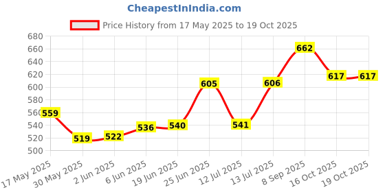 The current price is ₹617, which is ₹98 (18.9%) higher than the best price of ₹519 last seen on 30 May 2025. Over the 154 day price history period, prices have ranged from ₹519 to ₹662, with an average of ₹575. The pricing shows moderate volatility, but the overall trend is concerning as prices are getting more expensive. In terms of recent activity, there have been 0 price changes this week, 0 this month, and 9 over the past year. If you need this product now, it's a reasonable time to buy as prices are stable, but you might want to monitor for potential better deals.