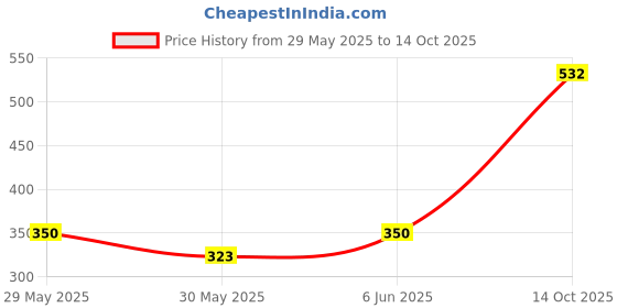 The current price is ₹532, which is ₹209 (64.7%) higher than the best price of ₹323 last seen on 30 May 2025. Over the 138 day price history period, prices have ranged from ₹323 to ₹532, with an average of ₹389. The pricing shows high volatility with significant fluctuations, but the overall trend is concerning as prices are getting more expensive. In terms of recent activity, there have been 0 price changes this week, 0 this month, and 3 over the past year. Consider waiting before making a purchase as prices are rising and better deals may be available later.