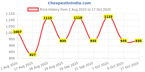 The current price is ₹935, which is ₹108 (13.1%) higher than the best price of ₹827 last seen on 17 Aug 2025. Over the 75 day price history period, prices have ranged from ₹827 to ₹1,125, with an average of ₹992. The pricing shows moderate volatility, and the overall trend is favorable for consumers as prices are getting cheaper. In terms of recent activity, there have been 0 price changes this week, 2 this month, and 7 over the past year. This is an excellent time to make a purchase as prices are trending downward and conditions appear favorable.