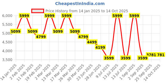 The current price is ₹3,781, which is ₹182 (5.1%) higher than the best price of ₹3,599 last seen on 9 Jul 2025. Over the 272 day price history period, prices have ranged from ₹3,599 to ₹5,999, with an average of ₹4,836. The pricing shows high volatility with significant fluctuations, and the overall trend is favorable for consumers as prices are getting cheaper. In terms of recent activity, there have been 0 price changes this week, 0 this month, and 16 over the past year. The price direction is uncertain, so monitor the situation for a few more days before making a decision.