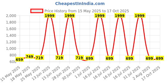 The current price is ₹699, which is ₹40 (6.1%) higher than the best price of ₹659 last seen on 15 May 2025. Over the 154 day price history period, prices have ranged from ₹659 to ₹1,999, with an average of ₹1,137. The pricing shows high volatility with significant fluctuations, but the overall trend is concerning as prices are getting more expensive. In terms of recent activity, there have been 0 price changes this week, 0 this month, and 13 over the past year. The price direction is uncertain, so monitor the situation for a few more days before making a decision.