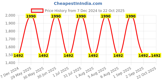 Awesome! The current price of ₹1,492 is at its best ever level. Over the 318 day price history period, prices have ranged from ₹1,492 to ₹1,990, with an average of ₹1,700. The pricing shows moderate volatility, with prices remaining relatively stable overall. In terms of recent activity, there have been 0 price changes this week, 0 this month, and 10 over the past year. The price direction is uncertain, so monitor the situation for a few more days before making a decision.