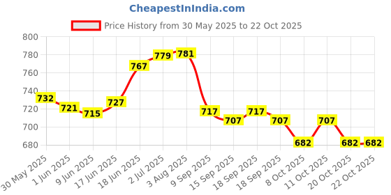 Exciting update! The current price of ₹682 is at its best ever level. Over the 144 day price history period, prices have ranged from ₹682 to ₹781, with an average of ₹722. The pricing has been quite stable with low volatility, and the overall trend is favorable for consumers as prices are getting cheaper. In terms of recent activity, there have been 0 price changes this week, 2 this month, and 13 over the past year. If you need this product now, it's a reasonable time to buy as prices are stable, but you might want to monitor for potential better deals.