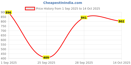 The current price is ₹802, which is ₹393 (96.1%) higher than the best price of ₹409 last seen on 25 Sep 2025. Over the 43 day price history period, prices have ranged from ₹409 to ₹896, with an average of ₹737. The pricing shows high volatility with significant fluctuations, and the overall trend is favorable for consumers as prices are getting cheaper. In terms of recent activity, there have been 0 price changes this week, 2 this month, and 3 over the past year. The price direction is uncertain, so monitor the situation for a few more days before making a decision.