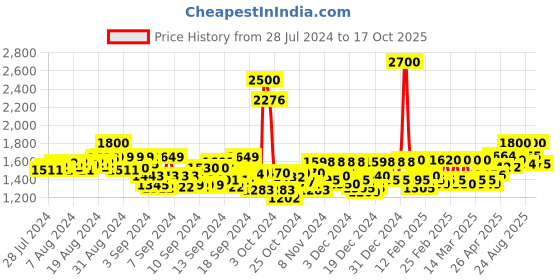 The current price is ₹1,575, which is ₹373 (31.0%) higher than the best price of ₹1,202 last seen on 6 Oct 2024. Over the 446 day price history period, prices have ranged from ₹1,202 to ₹2,700, with an average of ₹1,517. The pricing shows moderate volatility, with prices remaining relatively stable overall. In terms of recent activity, there have been 0 price changes this week, 0 this month, and 47 over the past year. If you need this product now, it's a reasonable time to buy as prices are stable, but you might want to monitor for potential better deals.