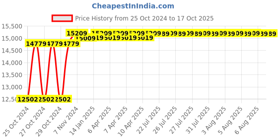 The current price is ₹15,189, which is ₹2,687 (21.5%) higher than the best price of ₹12,502 last seen on 25 Oct 2024. Over the 356 day price history period, prices have ranged from ₹12,502 to ₹15,209, with an average of ₹14,858. The pricing shows moderate volatility, but the overall trend is concerning as prices are getting more expensive. In terms of recent activity, there have been 0 price changes this week, 0 this month, and 28 over the past year. If you need this product now, it's a reasonable time to buy as prices are stable, but you might want to monitor for potential better deals.